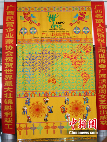今天,由中國(guó)工藝織錦大師譚湘光和8名“織女”經(jīng)過(guò)96天織就的世界最大壯錦,在“廣西活動(dòng)周”開(kāi)幕式上贈(zèng)獻(xiàn)給上海世博會(huì),壯錦長(zhǎng)6.2米,寬3.6米。同時(shí),“世界最長(zhǎng)板鞋”亦亮相“廣西活動(dòng)周”,該板鞋共23節(jié),每節(jié)2.2米,總長(zhǎng)為50.6米,由115位身穿少數(shù)民族盛裝的青年男女腳踏板鞋喊著號(hào)子向前行走。(完)