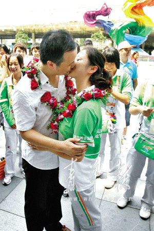 編號:20108161314。兩位新人從園區(qū)志愿者部部長夏科家手上接過了獨(dú)一無二的世博結(jié)婚證。這個(gè)編號不但是對他們婚禮吉時(shí)的記錄,也是對他們幸福生活的美好祝福!坝H一個(gè)!親一個(gè)!”圍在新人周圍的99位“小白菜”可不會輕易放過這位和自己朝夕相處的老師,開始起哄。大庭廣眾之下,施諾哪好意思,對著新娘的額頭就是一下蜻蜓點(diǎn)水,想要糊弄過關(guān)!安凰悖〔凰!”聲音越來越響,不少游客也忍不住駐足觀望。迫于“群眾壓力”,兩人在七彩之心下深情一吻,接受所有人的祝福。
