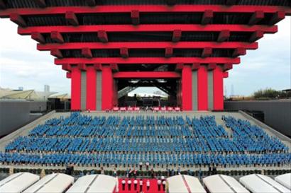 世博園內(nèi),“小白菜”們夾道歡迎老師們?nèi)雸;中國館前,2010名老師莊嚴(yán)宣誓,并共同唱響《教師之歌》。昨天是第26個教師節(jié),“奉獻(xiàn)世博·奠基未來”——2010年上海市慶祝教師節(jié)主題系列活動之宣誓儀式在中國館南廣場舉行。市委副書記殷一璀出席儀式并致辭,副市長沈曉明出席。