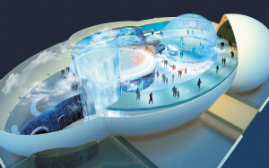展館內(nèi)部以“云中漫步”概念為主線,進(jìn)入世界氣象館,參觀者仿佛搭乘“穿云飛船”置身于云層中,一路漫步“氣候變化云廊”,領(lǐng)略“云頂觀象”奇觀,觀測(cè)“小球大世界”實(shí)時(shí)變化、體驗(yàn)“世博氣象臺(tái)”科技實(shí)力,展望“未來之家”的優(yōu)質(zhì)氣象服務(wù)。