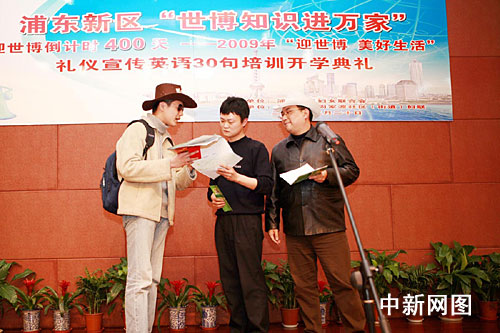 開(kāi)學(xué)典禮上,來(lái)自周家渡的社區(qū)單位、居民區(qū)、學(xué)校、幼兒園等分別展示了應(yīng)用英語(yǔ)30句來(lái)演繹的小品,“我們都是志愿者”、“摩登爺爺學(xué)英語(yǔ)”等,給大家上了一堂生動(dòng)的禮儀知識(shí)課。整個(gè)會(huì)場(chǎng)座無(wú)虛席,氣氛熱烈。課后學(xué)員們對(duì)于世博英語(yǔ)的許多問(wèn)題進(jìn)行了現(xiàn)場(chǎng)探討。