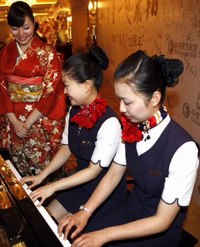 慶典儀式通過圖片展和影像資料展示了從1989年至今的20年里的“凌燕”2光輝歷程,F(xiàn)場數(shù)十名“凌燕”機(jī)組人員通過調(diào)酒、烹飪、手語、太極等表演形式展現(xiàn)了“凌燕”組員多才多藝和“至尊、至誠、至精、至美”的服務(wù)理念。