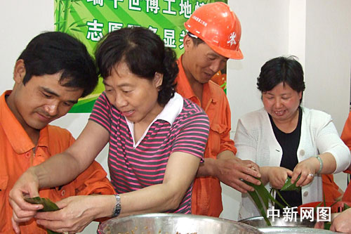 中新網(wǎng)上海5月28日電(舒祖康 鄭瑩瑩)“粽葉要平整,肉要放在米的中間,繩要扎緊……”端午時節(jié),上海浦東世博社區(qū)——上鋼街道的居民來到上海世博會專用隧道建設工地,與建設者們一起包粽子 、過端午節(jié)。西藏南路越江隧道工地食堂里,十多名社區(qū)居民圍著桌子,一邊包、一邊指導著前來學包粽子的世博建設者們。食堂的一旁,上鋼社區(qū)文化中心藝術團的隊員們還為就餐的工人們獻上一段段精彩歌舞以表示慰問。完