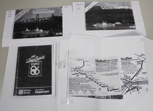 下面我分別談這兩件事的情況。當(dāng)我抵加拿大溫哥華,哥哥們 一定要我去參觀舉世矚目的1986年溫哥華世博會(EXPO),親友們很快為我購買了精致的入場券。因為每次去用車載我參觀,一參觀一整天(從上午10點到下午9點),我只去過兩次,去幾個國家地區(qū),每到一個地區(qū)、國家可蓋紀(jì)念章。這張入場券像一本護(hù)照,做得很精致,同時各個地區(qū)、國家有種種介紹的冊子。我要來不少冊子,后來在搬家中丟失了。這本“護(hù)照”留地方蓋當(dāng)日入場日期,并留了不少空白號蓋章用。我參觀了兩次(1986年5月26日及5月31日),我保存入場券上有蓋紀(jì)念章包括中國館、加拿大安大略省(法文地區(qū))、日本、馬來西亞、韓國、羅馬尼亞、加拿大、肯尼亞、澳大利亞、巴基斯坦等。我入場券號碼是0370014,首一頁是當(dāng)?shù)厥组L(籌備館負(fù)責(zé))歡迎詞,在第二頁上寫上自己的名字、地址及自己簽名,寫上三日護(hù)照(Three day passport)與皇家銀行(Royal Bank)合辦。并有一張1986年溫哥華EXPO導(dǎo)游圖,標(biāo)出80個地區(qū)、國家所在。我還有保存兩本介紹溫哥華風(fēng)景小冊子,每一本冊子包括14個風(fēng)景區(qū),每本定價1.5元。