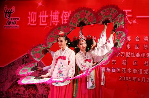 6月27日下午,上海市浦東新區(qū)花木社區(qū)文化活動中心熱鬧非凡,熱烈的掌聲和歡快的音樂聲不時地響起,由上海世博局和2012年韓國麗水世博會組委會聯(lián)合主辦、上海市學習型社會建設服務指導中心和浦東新區(qū)社區(qū)學院協(xié)辦的“迎世博倒計時300天——中韓民眾社區(qū)大聯(lián)歡”活動正在這里舉行。麗水世博會組委會秘書長金丙一、韓國駐滬副總領事延上模、上海世博局副局長朱詠雷、上海市學習型社會建設服務指導中心副主任王連華等出席活動。