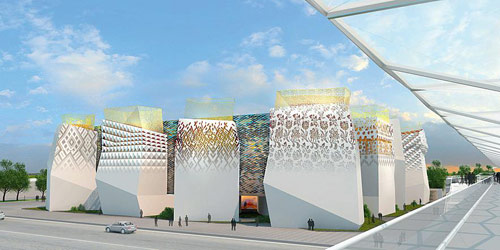 以“新俄羅斯:城市與人”為主題的俄羅斯館由12個塔樓和“懸浮在空中”的立方體組成,外形設計類似古代斯拉夫人的小村落,象征著生命之花、太陽以及世界樹(斯拉夫人枝葉繁茂的橡樹)的根。塔樓由白、金、紅三種顏色構(gòu)成,白色和金色塑造了俄羅斯建筑的歷史形象,而紅色底色加上富有俄羅斯各民族元素的圖案,則賦予了塔樓頂部鏤空部分以生命力。