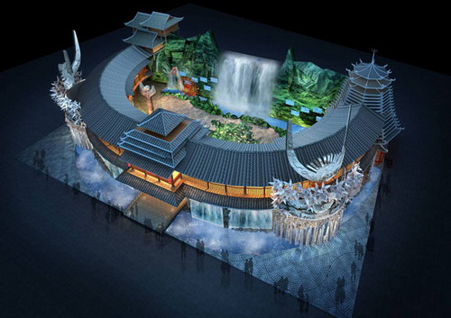 貴州館平均高度為7.2米,極端高度達8.5米,展示主題為“醉•美貴州,避暑天堂”。在600平方米的展示面積中,將貴州的自然山水和多元民俗文化巧妙結(jié)合,抽取風雨橋、鼓樓、苗寨、銀飾和山水瀑布極具貴州特色的視覺元素,高度凝煉貴州人文自然風貌以及“醉•美”和“避暑”的特色。強烈的視覺沖擊力和民俗特色,力求使絕大多數(shù)不了解貴州或從未踏足過貴州的參觀者,也能在第一時間內(nèi)對貴州館留下深刻的印象。