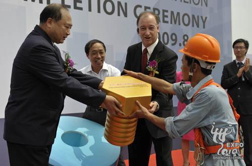 8月26日上午,2010年上海世博會(huì)上汽-通用汽車(chē)館鋼結(jié)構(gòu)正式封頂,標(biāo)志性的螺旋型建筑外觀雛形初現(xiàn)。上海世博局黨委副書(shū)記許偉國(guó)、上海汽車(chē)副總裁肖國(guó)普、通用汽車(chē)中國(guó)公司總裁兼總經(jīng)理甘文維等出席封頂儀式,共同見(jiàn)證最后一顆螺釘釘入鋼梁。