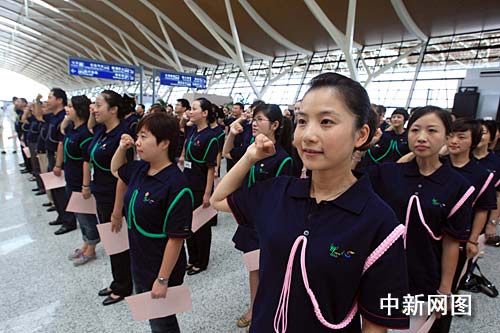 中新網(wǎng)上海9月4日電 (常惠英 蘇巍巍) 9月4日上午,上海機(jī)場集團(tuán)在浦東機(jī)場T2航站樓舉行了上海機(jī)場世博志愿者服務(wù)總隊成立儀式,120名身著統(tǒng)一服裝的志愿者代表在9名勞模的帶領(lǐng)下莊嚴(yán)宣誓,“我志愿成為一名光榮的上海機(jī)場世博志愿者。我承諾:盡已所能,不計報酬,幫助他人,服務(wù)社會!鄙虾C(jī)場集團(tuán)副總裁、上海機(jī)場世博志愿者服務(wù)總隊第一副總隊長朱寧一向4支志愿者服務(wù)隊授牌。