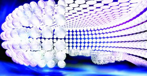 幻影繡球——在展示大廳中心懸墜直徑在60—80厘米之間的幻影繡球,繡球外觀經(jīng)時尚化、科技化處理,通體為透明材質(zhì),內(nèi)嵌4塊顯示屏達到全角度視頻展示,通過地面投影、LED視屏與照片傳輸技術(shù)融為一體的時尚科技完成即時成像,當參觀者走過幻影繡球下時,繡球上便會映出相應(yīng)影像。