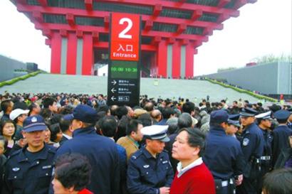 上午10點(diǎn),由于人流過(guò)于擁擠,亞洲廣場(chǎng)旁的預(yù)約點(diǎn)預(yù)約機(jī)陷入癱瘓,全面停止了預(yù)約。工作人員在現(xiàn)場(chǎng)用擴(kuò)音機(jī)與排隊(duì)的參觀者隔空喊話,大約10多分鐘后,人潮漸漸散去。對(duì)于這個(gè)突發(fā)的情況,預(yù)約點(diǎn)的工作人員表示,希望參觀者可以自行分流,雖然有些預(yù)約點(diǎn)的地理位置離中國(guó)館相對(duì)較遠(yuǎn),但每張預(yù)約券都預(yù)留了至少1個(gè)小時(shí)的提前量,如果9點(diǎn)打印的預(yù)約券,上面的預(yù)約時(shí)間至少是10點(diǎn)以后,因此,無(wú)論在展區(qū)的任何一個(gè)預(yù)約點(diǎn)預(yù)約,走到中國(guó)館參觀都是來(lái)得及的。