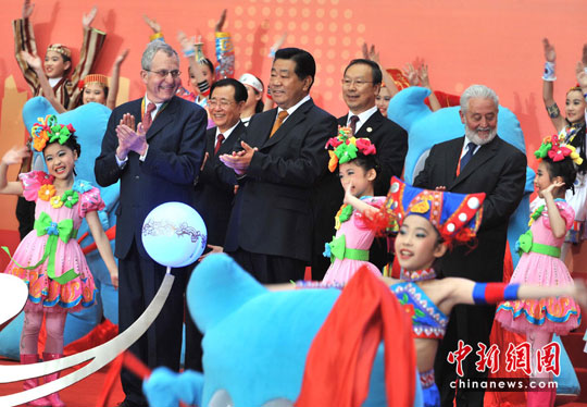 致辭完畢,賈慶林與讓·皮埃爾·藍(lán)峰共同啟動(dòng)開園按鈕,象征性地開啟了2010年上海世博會(huì)的大門。按鈕啟動(dòng)后,前方一個(gè)裝置設(shè)備上的圓環(huán)慢慢圍繞一把“金鑰匙”旋轉(zhuǎn)起來,形如一個(gè)地球儀,效果令人印象深刻。