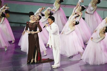 約半個小時的開幕式演出,聚合了五大洲的頂級明星,星光璀璨照耀浦江。在嘉賓入場后,由上海大學(xué)生組成的800人合唱團唱起一曲《和諧歡歌》,“鮮花簇擁約定地方,熟悉沒見過的臉龐,呼喚聽見心靈激蕩,邀世界分享……”著名歌唱家宋祖英和國際巨星成龍攜手出場,為本次世博會開幕唱響第一個強音。