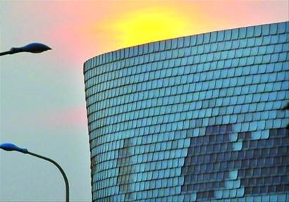 為什么帷幕能發(fā)電?原因就來自于帷幕上掛著的那1萬個(gè)“小太陽”,每個(gè)“小太陽”都有1塊內(nèi)嵌太陽能智能電池板,可以吸收光能而發(fā)出閃光。據(jù)介紹,這些小太陽的學(xué)名是聚碳酸酯板,每個(gè)20厘米見方,包括一個(gè)能量發(fā)生器、一個(gè)存儲介質(zhì)和一個(gè)LED形式的電力負(fù)載。吸收太陽光后,產(chǎn)生的能量可以轉(zhuǎn)換為白色燈光。在游客的照相機(jī)閃光燈閃亮?xí)r,“小太陽”便會回閃,如同在對你眨眼睛一般。隨之,它周圍的“鄰居”在感知動靜后,形成“多米諾效應(yīng)”,整個(gè)外墻就會閃成一片紅色光海。值得一提的是,1萬個(gè)“小太陽”白天在吸收太陽能和其他光能后,晚上就能為展館燈光供電。