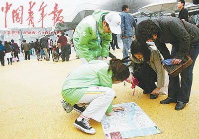 中國(guó)館南廣場(chǎng)上的30名首批志愿者都是來(lái)自復(fù)旦大學(xué)的學(xué)生。他們的工作在很多人看來(lái)很簡(jiǎn)單,就是疏導(dǎo)游客,給游客指路。他們每天要重復(fù)幾萬(wàn)次的回答就是:“對(duì)不起,預(yù)約券已經(jīng)發(fā)完了”,“您好,請(qǐng)往這邊走”……“現(xiàn)在我已經(jīng)不用看地圖就能清楚地給游客指路了。以前還不熟悉的時(shí)候,我利用休息的時(shí)間不斷地看地圖,已經(jīng)翻爛了兩份地圖,這是第三份了。”錢(qián)琲從包里翻開(kāi)她的園區(qū)地圖,這一份也已經(jīng)快被她翻爛了,快斷裂的地方她用透明膠布粘著。