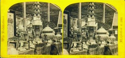 其中1862年倫敦世博會中國館立體照片,是迄今為止發(fā)現的世博會上有關中國館的最早的原版照片,彌足珍貴。照片由兩張一模一樣的正方形泛黃蛋白照組成。每張大小約在10厘米。底下一行英文小字顯示,照片由當年的倫敦立體攝影公司制作完成。