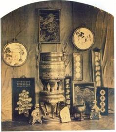 史料記載,1862年世博會上中國的參展規(guī)模很小,沒有單獨的展館,只是在主展廳內有一個小小的展區(qū)展出一些陶瓷等中國土特產。照片印證了這一點。中國展示的有瓷器、佛像、琺瑯器、寶塔等,還有一張巨幅祖宗油畫。沒有獨立展館,但一個外國孩童正定睛觀看展品,初步顯示了東方藝術獨特魅力。