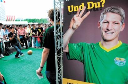 南非館前的籠式足球游戲成為園區(qū)最熱門的互動(dòng)項(xiàng)目之一。雖然獎(jiǎng)品只是世界杯紀(jì)念水壺,可球迷們都表示不是沖著獎(jiǎng)品去的,幾小時(shí)內(nèi)數(shù)百人在鐵籠中大秀腳法。期間,也有外國(guó)游客躍躍欲試。一名叫卡爾的德國(guó)男子看到足球就來(lái)勁,上前擺出的架勢(shì)頗為專業(yè),最后還是三次全部踢偏。