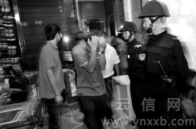 “緊急通知,今晚九點(diǎn)半在分局集中,參加統(tǒng)一行動(dòng)!蓖21時(shí)左右,官渡公安分局治安大隊(duì)民警們突然接到了臨時(shí)通知。22時(shí),內(nèi)線發(fā)出信號,警車開往珥季路某娛樂會(huì)所。當(dāng)50多名全副武裝的警察沖進(jìn)該娛樂場所時(shí),訓(xùn)練有素的迎賓們并沒有慌亂,漂亮的姑娘們依舊招牌式笑著:“歡迎光臨”。