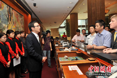 希爾頓重慶總經(jīng)理冀宏飛向檢查驗收組介紹說,在被警方停業(yè)整頓后,重慶希爾頓酒店對酒店高層、主管和員工進行了培訓(xùn),集中學(xué)習(xí)政府和警方相關(guān)的法律法規(guī)。來自希爾頓(中國)上?偛康膬擅0膊扛吖芙裉煲矊⒌诌_(dá)重慶,對重慶希爾頓酒店的安保人員進行培訓(xùn)和重組。