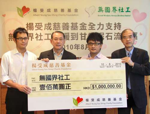 楊受成昨日以“楊受成慈善基金”名義,捐出一百萬(wàn)港元予無(wú)國(guó)界社工。無(wú)國(guó)界社工將派出五名義工于本周五或以前到災(zāi)區(qū)視察災(zāi)情,并安排該一百萬(wàn)元善款購(gòu)買(mǎi)災(zāi)民目前最需要的物資,例如一般生活必需品等。首批物資最快可于本月二十日送到災(zāi)民手中。