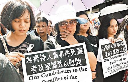 中新網(wǎng)8月30日電 據(jù)香港星島日?qǐng)?bào)報(bào)道,香港特區(qū)立法會(huì)各政團(tuán)發(fā)起“悼念菲律賓遇難港人”大游行的同時(shí),多個(gè)菲律賓團(tuán)體二十九日上午也舉行祈禱會(huì)表達(dá)哀傷,聚集近四百人,悼念馬尼拉挾持人質(zhì)事件的死難者。菲律賓傭工協(xié)會(huì)發(fā)言人表示,菲律賓人與港人一樣對(duì)事件感到哀傷和憤怒,要求當(dāng)局徹查事件。
