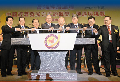 “中國(guó)經(jīng)濟(jì)發(fā)展方式的轉(zhuǎn)變.機(jī)遇與挑戰(zhàn)”高端經(jīng)濟(jì)論壇17日在港舉行。圖為主禮嘉賓為論壇開(kāi)幕亮燈。 潘達(dá)文 攝