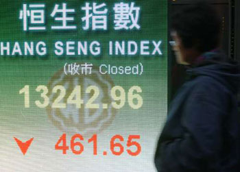 華爾街股市日前急挫3%,環(huán)球股市再現(xiàn)骨牌式的下跌,韓國股市暴跌超過6%,日股挫近5%,香港股市也難逃一劫,加上“大笨象”匯控被“摩笛”嚇倒,拖累恒指15日裂口低開568點,開市不足10分鐘,恒指在13000點岌岌可危,在中午收市前最多暴跌800點至12904點低位。