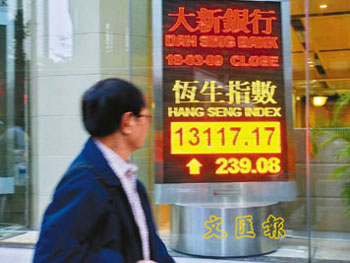 中新網(wǎng)3月19日電 據(jù)香港《文匯報(bào)》報(bào)道,受到外圍金融股造好,港股18日隨美股高開175點(diǎn),匯控連升7天,重上42元,帶動(dòng)恒指重上13000點(diǎn),大市全日升239點(diǎn)或1.86%,收?qǐng)?bào)13117點(diǎn)。國(guó)企指數(shù)升124點(diǎn),報(bào)7632點(diǎn)。不過(guò),大市成交縮減至375億元;期指收?qǐng)?bào)13113點(diǎn),升289點(diǎn),比現(xiàn)貨低水4點(diǎn),成交65441張。
