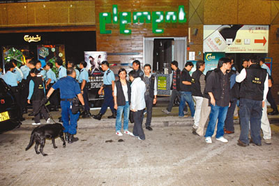 其間,有組織罪案及三合會調(diào)查科聯(lián)同反黑組及機動部隊共50多人,帶同一頭緝毒犬,于昨凌晨2時30分,掩至尖沙咀寶勒巷3號至7號萬事昌商場,逐一突擊搜查上址多間娛樂場所;另外又到赫德道一帶多間夜店進行查牌,并向可疑人士查閱身份證明文件,行動持續(xù)10小時。