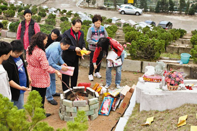 家族成員劉女士表示,祭品總值超過3000元,除部分洋酒、水果等食物會帶回家之外,其它諸如“金表”、“西服”等紙扎祭品都會在拜祭后燒給先人使用。她表示,潮汕人對傳統(tǒng)祭祀習俗非常重視,一年一次的拜祭先人一定是召集全家族齊出動。她又說:“年年祭祖,只有今年乳豬、燒雞、水果等祭品是雙份的,就連跪拜用的洋酒也帶了兩瓶?傊,大家的生活漸好,荷包也比往年漲一些,當然也希望祖先吃好過好!奔抑凶钚〕蓡T趙同學說,自己專門準備了黃菊花和百合獻給外公,“我今年是第一次來祭掃,還真沒見過這么隆重的祭祀場面!