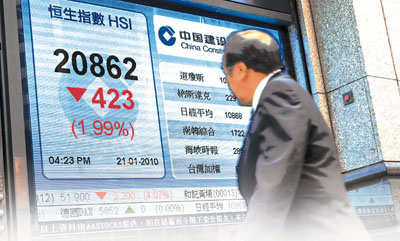 在內地公布去年第四季經(jīng)濟數(shù)據(jù)后,大市氣氛逆轉。在匯控、中移動及富士康等藍籌領跌之下,地產股跌幅擴大,中資金融股也全線下滑,令一度收復21日早失地的港股,午后再急瀉,曾低見20828點,跌近460點。恒指全日收報20862.6點,跌幅達2%,為3個月以來的低位,成交額835.9億元,顯示沽壓強大。