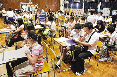 中新網(wǎng)7月8日電 據(jù)香港《文匯報(bào)》報(bào)道,香港今年6.8萬(wàn)名小六生中,成功獲派首三志愿學(xué)生只有85%,較去年下跌3%,余下過(guò)萬(wàn)名小六生希望落空。升中派位7日發(fā)榜后,即掀起一陣瘋狂叩門(mén)潮,不少失意學(xué)生及家長(zhǎng)紛紛把握最后機(jī)會(huì)四出往心儀學(xué)!皳洹睂W(xué)位,多間英中、名牌中中及直資中學(xué)也逼滿(mǎn)心急如焚的人潮。