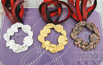 獎牌的9片花葉分別有香港的洋紫荊、中國的牡丹、日本的櫻花、韓國的木槿、中華臺北的梅花、澳門的荷花、蒙古的睡蓮、朝鮮的木蘭及關(guān)島的杜鵑。