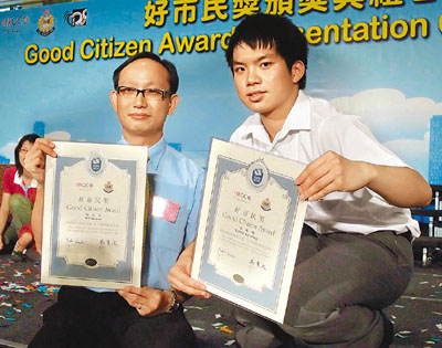 18日共有40名好市民得獎,15歲的容啟聰為最年輕的得獎者。本年1月,他參加運動會時發(fā)現(xiàn)一名可疑男子把一些手袋放到運動場外的私家車上,懷疑他偷去同學的財物,于是立即通知老師胡文安,并與胡一起追截該男子。該男子其后駕車逃去,他們立即記下其車牌號碼及報案。