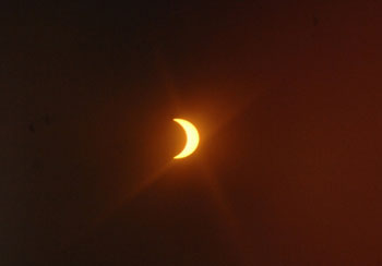 9時15分,四分之三個太陽被陰影遮蓋,之后就會慢慢復原,至10時半結(jié)束。