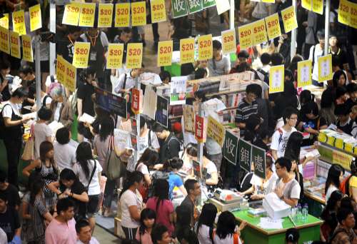 中新網(wǎng)7月28日電 據(jù)香港《大公報》報道,一連七天的香港書展28日閉幕,不少參展商把握最后機會促銷,包括提高折扣和擴大特價書區(qū)。商務(wù)、三聯(lián)等大書商也推出精選優(yōu)惠,語言學(xué)習(xí)書十元一本、套裝書半價,以及英語書“買二送一”,務(wù)求“要錢不要貨”。有參展商稱,場館擴大令人流分布不集中,即使劈價促銷,生意仍較去年暴跌七成。