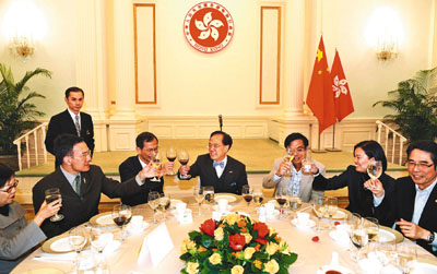 曾蔭權(quán)5日在禮賓府筵開5席,來自各黨各派的約40名議員依時(shí)赴會(huì),財(cái)政司司長曾俊華、律政司司長黃仁龍及大部分局長和副局長也同為座上客。據(jù)引述,曾蔭權(quán)在午宴上致辭時(shí)向議員們笑說,議事之外都有人情,火花之外都有風(fēng)花雪月,5日的宴請(qǐng)是希望大家除了公事之外,也有多些溝通和交流。