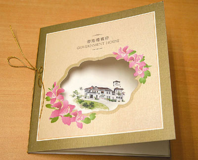 該賀卡由特區(qū)政府新聞處設計,封面是香港市花洋紫荊襯托下的禮賓府全景油畫,卡內寫上“恭賀新禧”及“Wishing you a Happy and Properous New Year”,并由曾蔭權簽名,誠意十足。