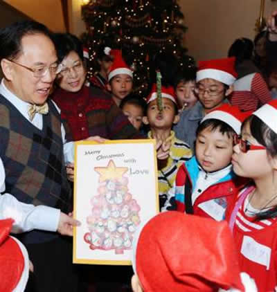 曾蔭權(quán)伉儷24日在禮賓府舉行了一個(gè)圣誕派對(duì),邀請(qǐng)40多位來(lái)自深水埗的小學(xué)生,擔(dān)任他的特別嘉賓,一同歡度一個(gè)溫馨愉快的早上。曾蔭權(quán)在博客中透露,自己與小朋友在圣誕樹(shù)前大合照,他們又送其一張巨型的圣誕卡,里面全是他們可愛(ài)的簽名和祝福,其中一句“祝你長(zhǎng)命一點(diǎn)”更是“搶眼”:“小孩的直率和可愛(ài),令我不禁失笑!