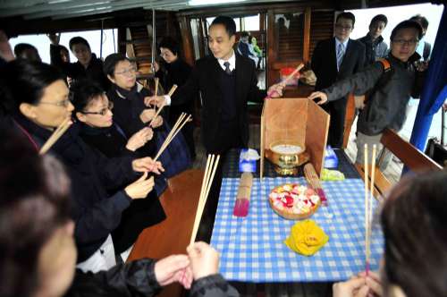 港府近年推廣骨灰海葬,惟租用私營(yíng)船只費(fèi)用高昂,需花費(fèi)二千至四千元,食環(huán)署特別推出免費(fèi)渡輪服務(wù),估計(jì)每年可處理近五百宗申請(qǐng),每年支出約十八萬(wàn)元。渡船服務(wù)自上月三十一日起接受申請(qǐng),截至昨日共收到二十三宗申請(qǐng),反應(yīng)不錯(cuò)。其中六個(gè)家庭率先于昨日啟航。他們小心翼翼地捧著六個(gè)骨灰甕,渡船由西灣河公眾碼頭出發(fā),前往東龍洲以東海域,準(zhǔn)備為這些往生者“集體海葬”。