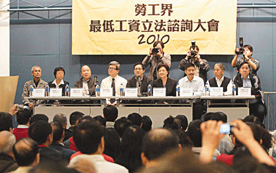 中新網(wǎng)4月27日電 據(jù)香港《文匯報(bào)》報(bào)道,港府正就香港首個最低工資水平收集各界意見。來自工聯(lián)會、勞聯(lián)及職工盟的勞工界昨日號召逾500人參與“武林大會”,討論最低工資最新形勢,與會人士的主流意見傾向?qū)⒆畹凸べY水平訂為時(shí)薪33至35元(港幣 下同),但亦有工會只要求訂為27元,故仍需待問卷調(diào)查完成統(tǒng)計(jì)后,才能定出一個代表勞工界的最低工資水平,估計(jì)約一星期后有結(jié)果。