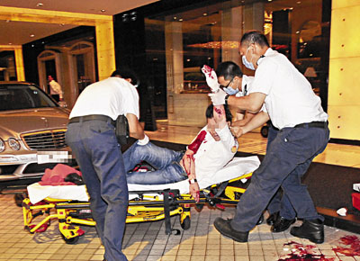 現(xiàn)場為尖東么地道香格里拉酒店門外,4日凌晨4時(shí)許,“泰龍”偕一男友人在酒店消遣后離開,行至酒店大門外分頭各自取回一輛名貴平治房車和一輛保時(shí)捷跑車,當(dāng)“泰龍”剛走到平治座駕旁,突有2輛車從前后高速駛至,其中一輛7人車從酒店行車通道入口直沖向他,“泰龍”閃避不及被撞至飛彈落地。另一輛私家車則從通道出口逆線駛?cè),車上跳?名分持開山刀殺手,直撲“泰龍”揮刀狂砍。