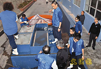 根據(jù)初步檢查結果,兩尾鱘魚不僅體內(nèi)有炎癥,體外也有不少擦掛傷口。專家會診后制定了“針療+藥物潑灑+水質調整”三路并進的治療方案,一方面按照每周兩次的頻率為鱘魚注射抗生素等針劑,同時每周向繁育池中潑灑2至3次調配好的粉狀藥物,主要功效都是消炎;刈顬榫o張的水質檢測,則指派專人負責每日抽樣送檢。