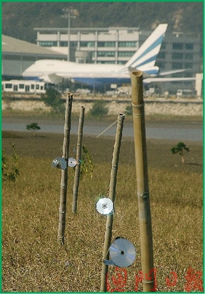 民署為免雀鳥(niǎo)在堆填區(qū)和淺灘覓食,到處亂飛而影響航班升降,18日上午派出工程人員在堆填區(qū)架設(shè)由回收光盤(pán)組成的反光裝置。該反光裝置由四片組成一個(gè)三角錐體,再以一條魚(yú)絲懸空吊在竹枝上,反光裝置可隨風(fēng)飄揚(yáng),將陽(yáng)光向四周折射,干擾雀鳥(niǎo)活動(dòng),從而驚嚇雀鳥(niǎo)。