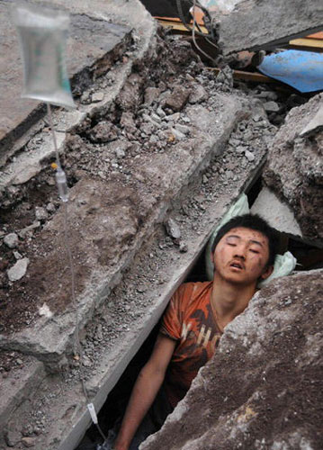 去年5月13日清晨6點多鐘,記者在北川中學(xué)的廢墟上,拍攝下了兩張照片:一個穿著黃色T恤、半昏迷的男孩,被夾在垮塌的教學(xué)樓預(yù)制板夾縫中,僅露出上半身;他的身邊,一個穿著藍(lán)色上衣的男孩,正為夾縫中的孩子拎著吊瓶。照片中的兩名男孩,就是后來被人們稱作“吊瓶兄弟”和“夾縫小子”的北川中學(xué)高一學(xué)生李陽和廖波。