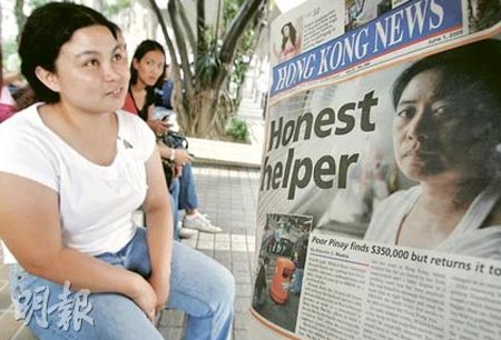 據(jù)香港《明報(bào)》報(bào)道,離鄉(xiāng)別井為兩餐,從菲律賓來港謀生的女傭Mildred Perez,不甘雇主對(duì)她做出的不法行為,訴諸法院,在候?qū)徠陂g不能另找工作,只靠拾荒維生,每天掙約38元生活費(fèi)。有一天,她意外地得到一個(gè)可擺脫貧困的機(jī)會(huì)——在垃圾堆中拾獲35萬元巨款,但她把錢全數(shù)退還失主,雖然換來的只是一盒曲奇餅作答謝,但她并無后悔,繼續(xù)其撿破爛的日子。