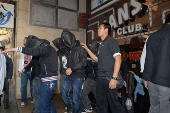 警員進(jìn)入酒吧后實時控制場面,繼而展開搜查,在店內(nèi)3間貴賓房內(nèi)先后搜出3把用紗布纏著刀柄長近3呎的開山刀及3柄牛肉刀,拘捕40男女,用膠塑帶兩人一組綁著押上警車帶署調(diào)查。