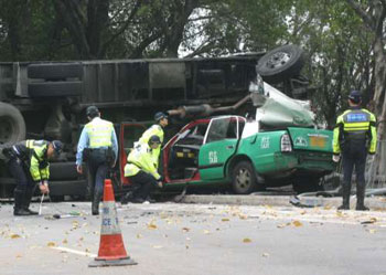 消防員接報趕至現(xiàn)場,發(fā)現(xiàn)被壓扁的的士車廂內(nèi)躺著6名男子,但已全部氣絕身亡,部分人更被壓至面貌變形,頭顱爆裂。警方事后驗出被告酒精含量是153微克,超標6倍半。