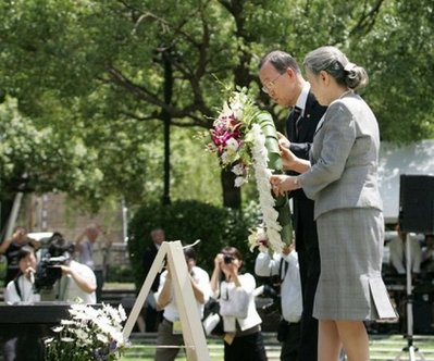 潘基文還前往爆炸中心地公園,向“原子彈落下中心地碑”獻(xiàn)花,然后向全世界宣布自己決心作為聯(lián)合國(guó)秘書長(zhǎng)全力創(chuàng)建“無核武世界”。此外,潘基文還向附近的“長(zhǎng)崎核爆朝鮮死難者追悼碑”獻(xiàn)了花。